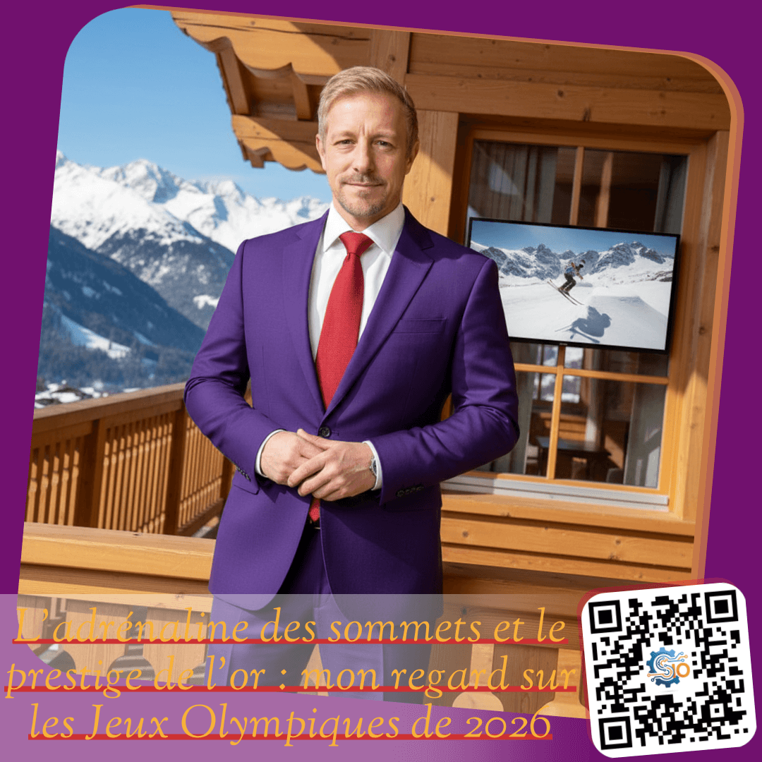 Le soleil se lève sur les sommets enneigés du Valais, inondant mon salon de cette lumière cristalline que seul le mois de février sait offrir. Confortablement installé dans mon chalet, j’ajuste la veste de mon costume violet. Ma cravate rouge est parfaitement nouée, et mes chaussures dorées brillent sous les rayons qui traversent les grandes … Allez-y, cliquez !L’ivresse des Jeux Olympiques et la ferveur du football : mon mercredi entre neige et pelouses