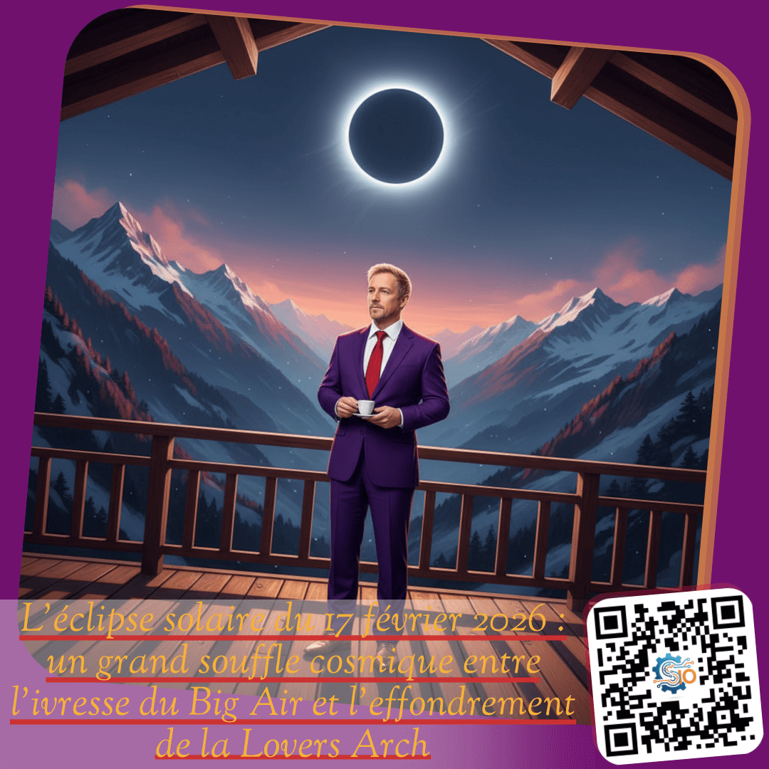 Mes chers amis, installez-vous confortablement. Je vous écris ces quelques lignes depuis mon chalet, ici au cœur des Alpes suisses. Ce mardi 17 février 2026 restera gravé dans nos mémoires, non pas pour un énième krach boursier ou une innovation technologique de rupture, mais pour ce silence. Un silence imposant, presque sacré. Aujourd’hui, la lune … Allez-y, cliquez !L’éclipse solaire du 17 février 2026 : un grand souffle cosmique entre l’ivresse du Big Air et l’effondrement de la Lovers Arch